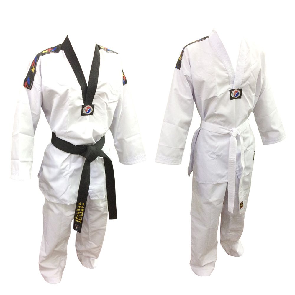A cor branca simboliza a parte obscura do Universo. De acordo com a filosofia da tradição coreana, a origem do Universo é pronunciada como Han. Han dentro das cores significa Branco. Na crença coreana, o branco representa a origem do universo. As golas dos atuais Dobok’s são em formato V. Diferem da tradicional vestimenta para diminuir o desconforto durante a prática do Taekwondo.